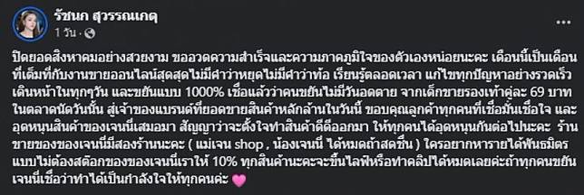 “ปิดยอดสิงหาคมอย่างสวยงาม ขออวดความสำเร็จและความภาคภูมิใจของตัวเองหน่อยนะคะ เดือนนี้เป็นเดือนที่เต็มที่กับงานขายออนไลน์สุดสุดไม่มีคำว่าหยุดไม่มีคำว่าท้อ เรียนรู้ตลอดเวลา แก้ไขทุกปัญหาอย่างรวดเร็ว เดินหน้าในทุกๆวัน และขยันแบบ 1000% เชื่อแล้วว่าคนขยันไม่มีวันอดตาย จากเด็กขายรองเท้าคู่ละ 69 บาทในตลาดนัดวันนั้น สู่เจ้าของแบรนด์ที่ยอดขายสินค้าหลักล้านในวันนี้ ขอบคุณลูกค้าทุกคนที่เชื่อมั่นเชื่อใจ และอุดหนุนสินค้าของเจนนี่เสมอมา สัญญาว่าจะตั้งใจทำสินค้าดีดีออกมา ให้ทุกคนได้อุดหนุนกันต่อไปนะคะ ร้านขายของของเจนนี่มีสองร้านนะคะ ( แม่เจน shop , น้องเจนนี่ ได้หมดถ้าสดชื่น ) ใครอยากหารายได้พันธมิตรแบบไม่ต้องสต๊อกของของเจนนี่เราให้ 10% ทุกสินค้านะคะจะขึ้นไลฟ์หรือทำคลิปได้หมดเลยค่ะถ้าทุกคนขยันเจนนี่เชื่อว่าทำได้เป็นกำลังใจให้ทุกคนค่ะ”