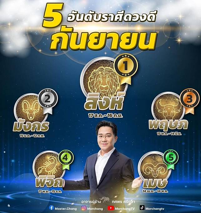 เมื่อวันที่ 2 กันยายน เข้าสู่เดือนใหม่แล้ว หมอช้าง ทศพร ศรีตุลา ได้จัด 5 อันดับราศีดวงดีเดือนกันยายน ไว้ดังนี้