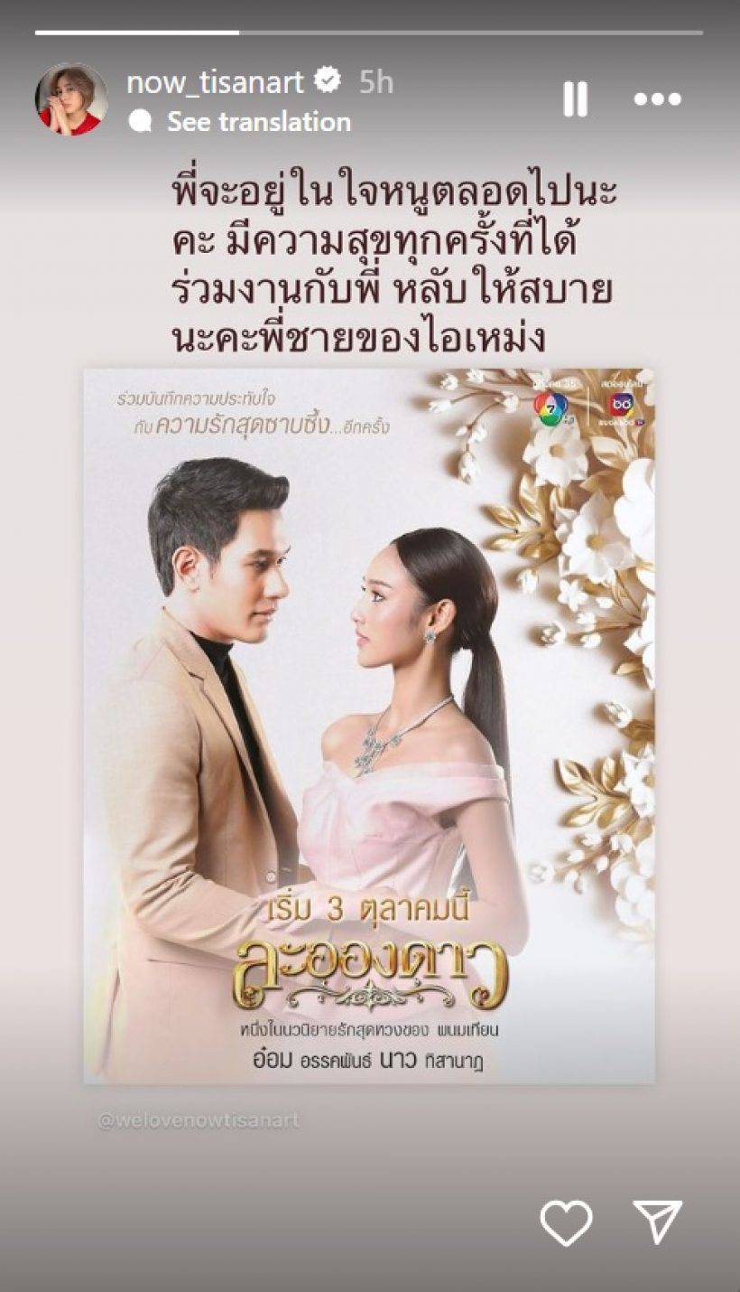 ล่าสุดนางเอกสาว นาว ทิสานาฎ ซึ่งเป็นนางเอกของอ๋อมในละครเรื่องนี้ ก็รีโพสต์พร้อมเขียนข้อความจากใจว่า