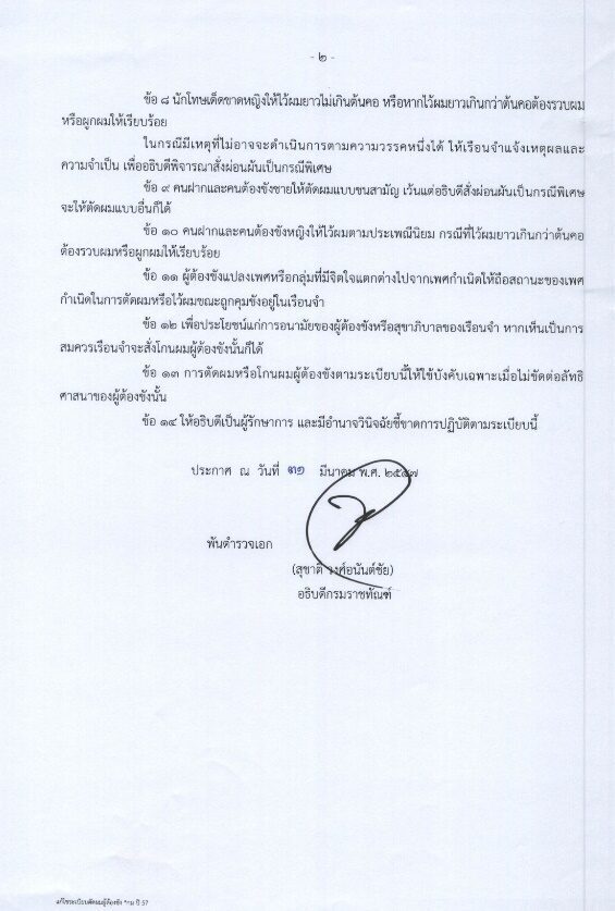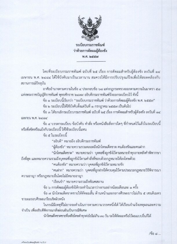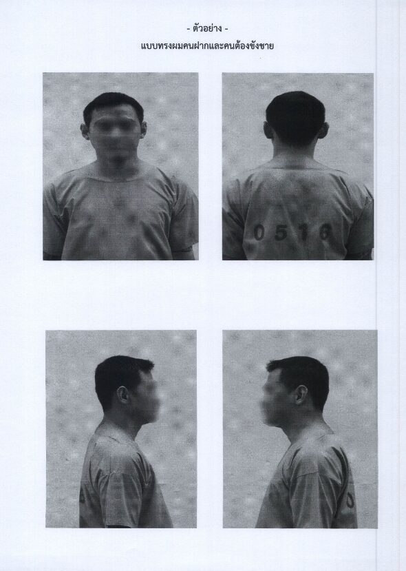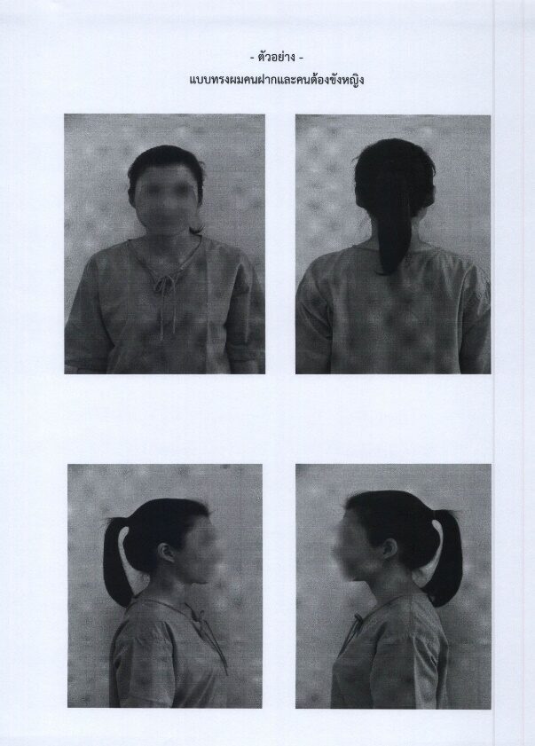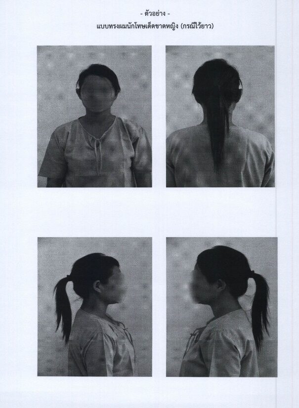 หรือผูกผมให้เรียบร้อยในกรณีมีเหตุที่ไม่อาจจะดำเนินการตามความวรรคหนึ่งได้ ให้เรือนจำแจ้งเหตุผลและความจำเป็น เพื่ออธิบดีพิจารณาสั่งผ่อนผันเป็นกรณีพิเศษข้อ 9 คนฝากและคนต้องขังชายให้ต้ดผมแบบชนสามัญ เว้นแต่อธิบดีสั่งผ่อนผันเป็นกรณีพิเศษจะให้ตัดผมแบบอื่นก็ได้