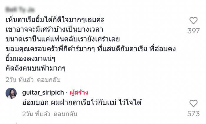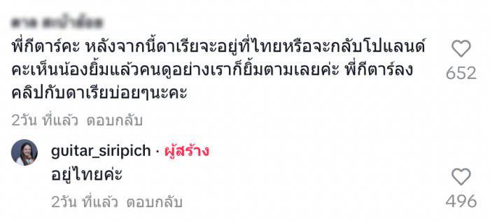 นอกจากนี้กีตาร์ ยังได้ตอบคอมเมนต์แฟน ๆ ที่เข้ามาถามด้วยว่า “พี่กีตาร์คะ หลังจากนี้ดาเรียจะอยู่ที่ไทยหรือจะกลับโปแลนด์คะเห็นน้องยิ้มแล้วคนดูอย่างเราก็ยิ้มตามเลยค่ะ พี่กีตาร์ลงคลิปกับดาเรียบ่อยๆนะคะ” ทาง กีตาร์ ก็ได้ตอบกลับไปว่า “อยู่ไทยค่ะ”