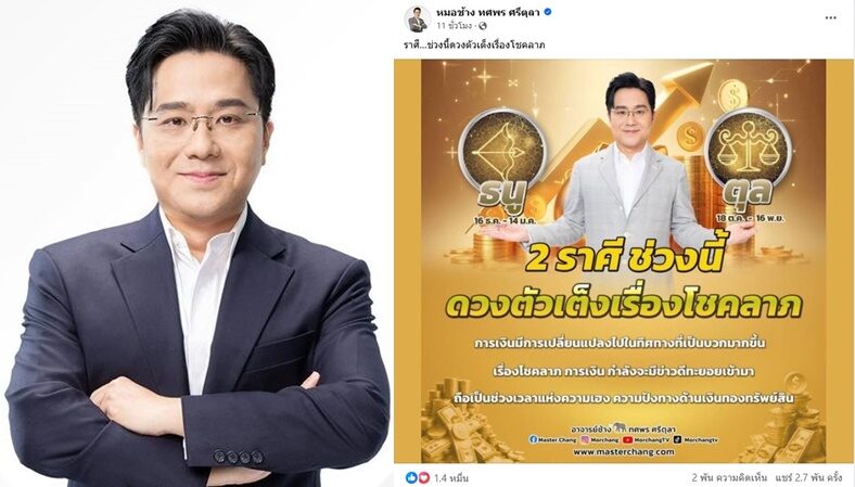 หมอช้าง ทศพร โพสต์ก่อนวันหวยออก เปิดราศีมีลุ้นโชคลาภว่า “ราศี…ช่วงนี้ดวงตัวเต็งเรื่องโชคลาภ” 2 ราศี ช่วงนี้ ดวงตัวเต็งเรื่องโชคลาภ