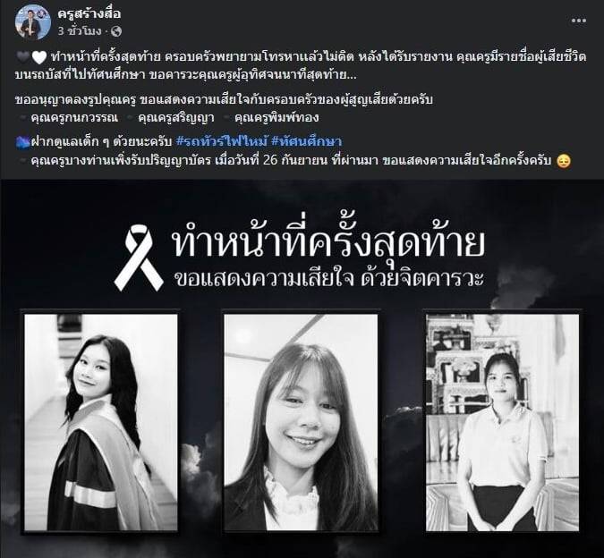 โซเชียลแห่สดุดี 3 ครูสาว ครูมิ้ม, ครูจอย และครูสาวน้อย ทำหน้าที่ปกป้องนักเรียนจากเหตุไฟไหม้รถบัสทัศนศึกษา จนวินาทีสุดท้ายของชีวิต