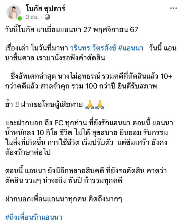 โดยระบุว่า“วันนี้โบกัส มาเยี่ยมแอนนา 27 พฤศจิกายน 67 เรื่องเล่า ในวันที่มาหา วรินทร วัตรสังข์ #แอนนา วันนี้ แอนนาขึ้นศาล เรามานั่งรอฟังคำตัดสิน
