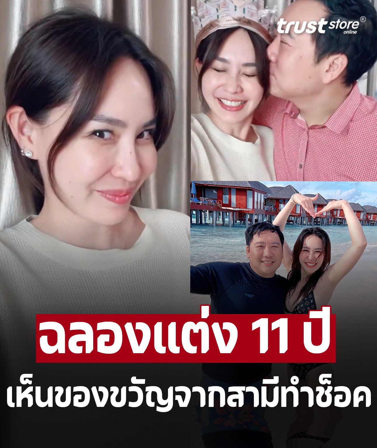 พร้อมเขียนแคปชั่นว่า “วันนี้เค้าทนฉันมา 11 ปีจ้า และนี่คือของขวัญที่เพิ่งถูกใจฉันเป็นปีแรก ตั้งแต่แต่งงานมา‼️#happyanniversary #11thanniversary #ครบรอบแต่งงาน ที่ฉันลืม ใดใดคือมงยังอยู่ไม่ถูกยึดนะคะ”