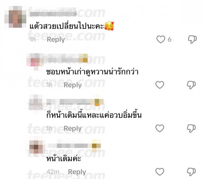 โดยชาวเน็ตหลายคนทักการเปลี่ยนเเปลงในครั้งนี้ไปในทิศทางที่ดี โดยบอกว่าเเต้วดูมีหน้าตาที่เด็กลง อาจจะเพราะเกี่ยวกับการเเต่งหน้า หรือ ทรงคิ้วที่ดูต่างไปจากเดิมก็ทำให้หน้าอาจจะเปลี่ยนได้