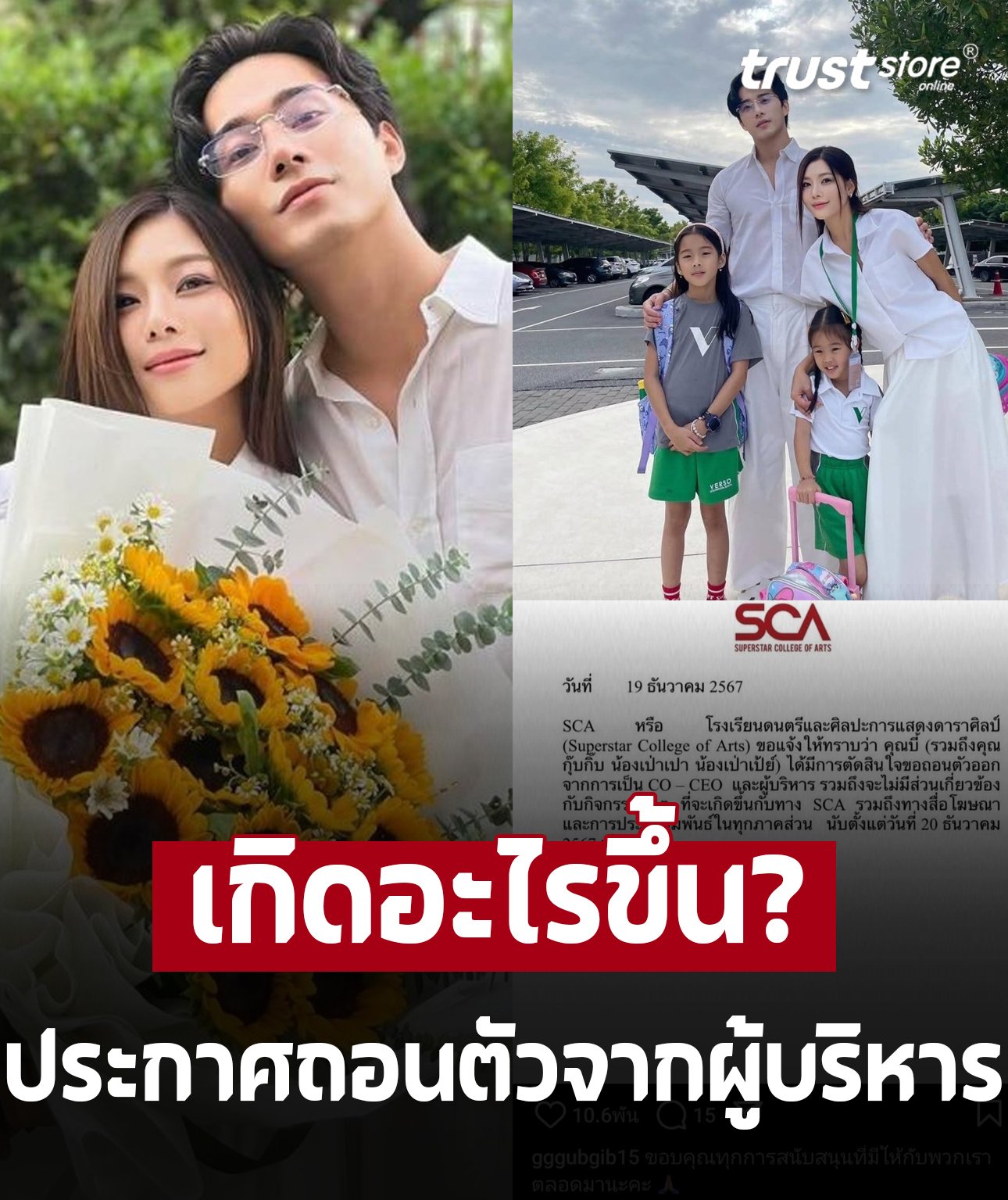 ทำเอาหลายคนสงสัยว่าเกิดอะไรขึ้น เมื่อ นักแสดงสาว กุ๊บกิ๊บ สุมณทิพย์ และสามี บี้ ธรรศภาคย์ ได้ออกมาประกาศผ่านอินสตาแกรมส่วนตัวของพวกเขาว่าจะขอถอนตัวออกจากการเป็น CO-CEO และผู้บริหารของ SCA หรือโรงเรียนดนตรีและศิลปะการแสดงดาราศิลป์ (Superstar College of Arts) โดยข้อความดังกล่าวเขียนเอาไว้ว่า