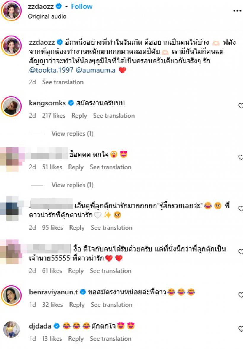 โดยสาวดาวโพสต์โมเมนต์เซอร์ไพรส์ลูกน้อง ลงอินสตราแกรม @zzdaozz พร้อมแคปชั่นระบุว่า “อีกหนึ่งอย่างที่ทำในวันเกิด คืออยากเป็นคนให้บ้าง หลังจากที่ลูกน้องทำงานหนักมากกกมาตลอดปีคับ เรามีกันไม่กี่คนแต่สัญญาว่าจะทำให้น้องๆภูมิใจที่ได้เป็นครอบครัวเดียวกันจริงๆ รัก @tookta.1997 @aumaum.a”