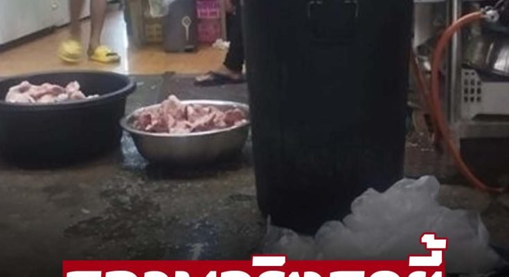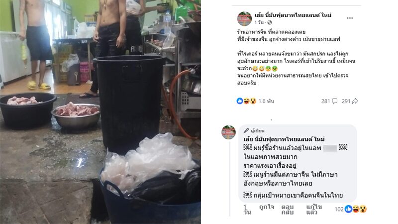 พร้อมแนบภาพพนักงานร้านยืนอยู่หลายคน ไม่ใส่เสื้อ ขณะที่มีกะละมังเนื้อสัตว์สดวางอยู่ที่พื้น ทางเพจยังเสริมอีกว่า “ผมรู้ชื่อร้านแล้วอยู่ในแอพฯดัง ในแอพฯภาพสวยมาก ราคาแรงเอาเรื่องอยู่ เมนูร้านมีแต่ภาษาจีน ไม่มีภาษาอังกฤษหรือภาษาไทยเลย กลุ่มเป้าหมายเขาคือคนจีนในไทย”