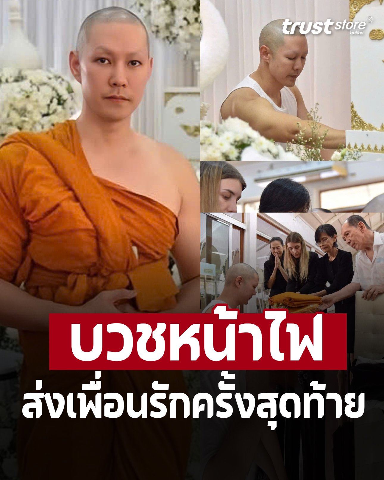 ก่อนหน้านี้นักแสดงหนุ่ม แอมป์ พีรวัศ เพื่อนร่วมสังกัดช่อง 7 ได้เข้าไปคุกเข่าขอขออนุญาตกับคุณแม่อ๋อม อรรคพันธ์ ตั้งใจจะบวชให้เพื่อนรักเป็นครั้งสุดท้าย