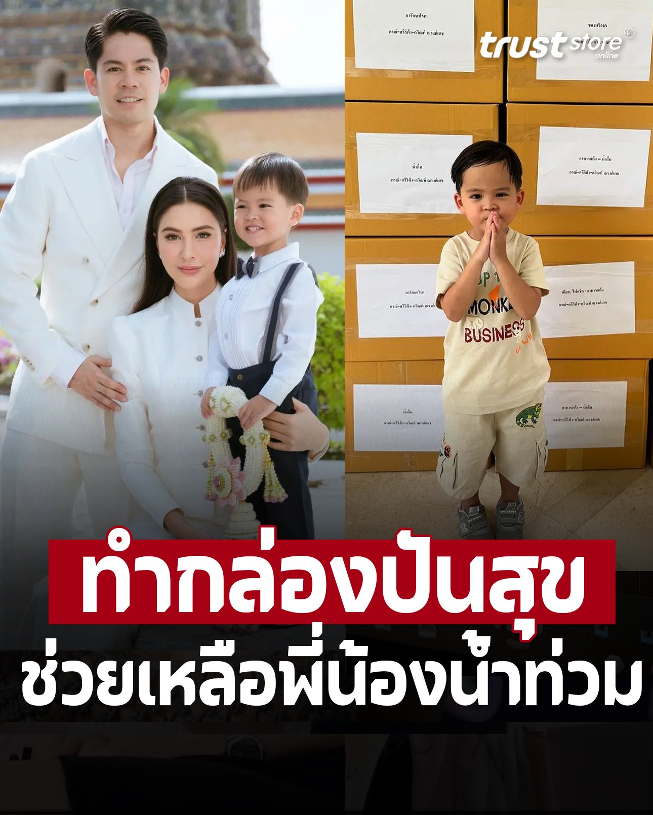 โดย บุ๋ม ได้โพสต์ภาพขณะขนกล่องปันสุขของ ริต้า – กรณ์ ลงอินสตาแกรม พร้อมระบุว่า “คุณกรณ์ และคุณศรีริต้า ฝากส่งกล่องปันสุขชุดใหญ่มาให้พี่น้องชาวเชียงรายด้วยนะคะ ขนขึ้นรถคอนเทนเนอร์เรียบร้อย ขอบคุณมาก ๆ ค่ะ รถหกล้อ สิบล้อ 22 ล้อ พร้อมยกขบวนช่วยน้ำท่วม @sritajensen”ด้าน ริต้า ก็ลงภาพที่ลูกชาย น้องกวิณท์ ยืนยกมือไหว้อยู่หน้ากล่องปันสุข พร้อมเขียนข้อความว่า “พวกเราครอบครัวขอเป็นกำลังใจให้ชาวเชียงรายทุกคนนะคะ ขอฝากพี่บุ๋มคนสวยด้วยนะคะ @boompanadda” .