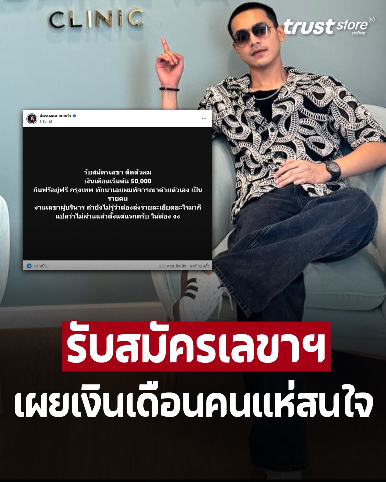 “รับสมัครเลขา ติดตัวผม เงินเดือนเริ่มต้น 50,000 กินฟรีอยู่ฟรี กรุงเทพ ทักมาเลยผมพิจารณาด้วยตัวเอง เป็นรายคน งานเลขาผู้บริหาร ถ้ายังไม่รู้ว่าต้องส่งรายละเอียดอะไรมาก็แปลว่าไม่ผ่านแล้วตั้งแต่แรกครับ ไม่ต้อง งง”