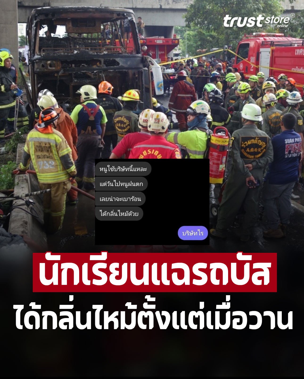ล่าสุดแฟนเพจเฟซบุ๊ก อีซ้อขยี้ข่าว : อีซ้อ ได้เปิดเผยแชทข้อความนักเรียนรายหนึ่ง พร้อมระบุข้อความว่า “รถทัวร์ที่ไฟไหม้ เมื่อวานเพิ่งพาเด็กอีกโรงเรียนไปทัศนศึกษากลับตอนค่ำ ๆ พบว่ามีกลิ่นไหม้ตั้งแต่เมื่อวานแล้ว”