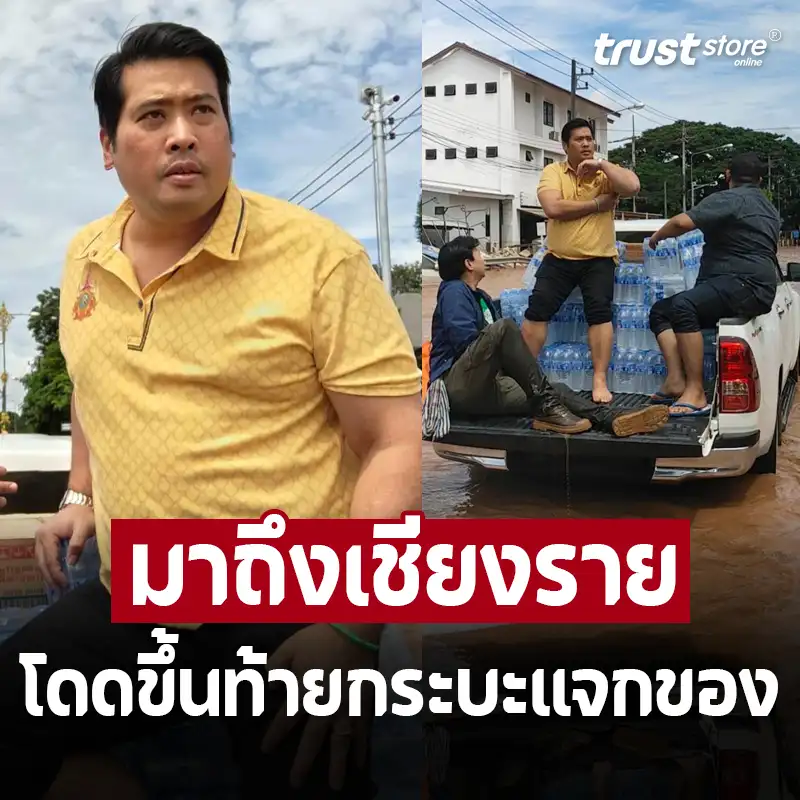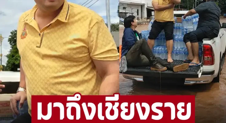 โดยในภาพท่านอ้น ได้ขนน้ำขึ้นท้ายรถกระบะ ก่อนท่านอ้นจะนั่งท้ายรถกระบะและตระเวนนำน้ำและอาหารไปแจกจ่ายให้ชาวบ้านที่ได้รับผลกระทบจากน้ำท่วมในจ.เชียงราย