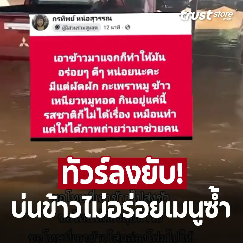 พร้อมข้อความตอบกลับโพสต์ดังกล่าวว่า “ขอโทษที่ข้าวไม่อร่อย ขอโทษที่เอาข้าวไปส่งช้า ขอโทษที่ต้องลุยน้ำไป ขอโทษที่เอาข้าวใส่กล่องโฟมไปให้ ขอโทษที่ทำได้แค่นี้ขอโทษค่ะ”