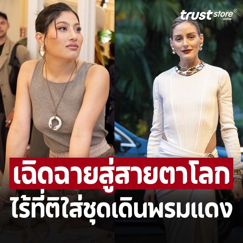 โอลิเวีย พาเลอร์โมสวมชุดสีขาว สง่างามด้วยบอดี้สูทแขนยาว ผ้าเจอร์ซีย์แนบตัว สวมทับด้วยกระโปรงยาวผ่าสูง โดดเด่นด้วยเทคนิคการจับเดรปประณีต ทิ้งชายผ้าพลิ้ว