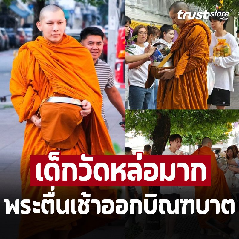 ‘พระมิว’ ตื่นเช้าออกบิณฑบาต มีเด็กวัดเดินตามหล่อสะดุดตามาก